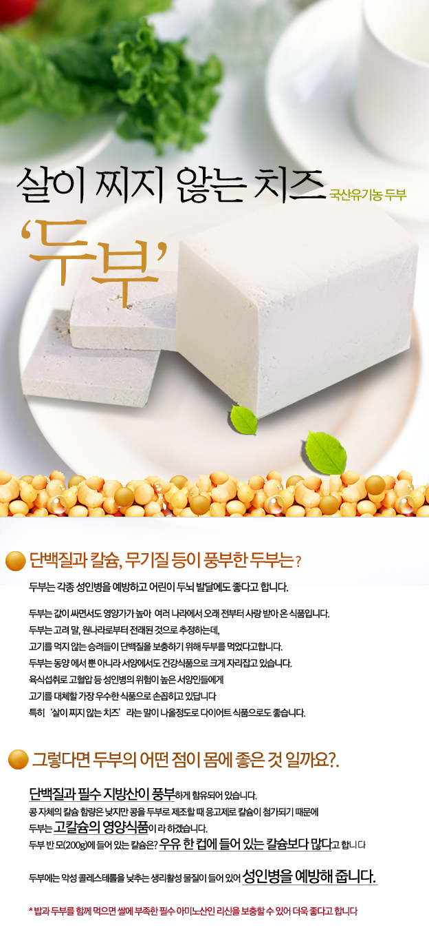 | 요약 | 맛이 부드럽고 자극이 없는, 콩으로 만든 음식.한국·중국·일본 및 동남아시아에서 단백질의 주요 급원으로 쓰이며 기원은 중국 한나라(BC 206~AD 220) 때라고 여겨진다. |