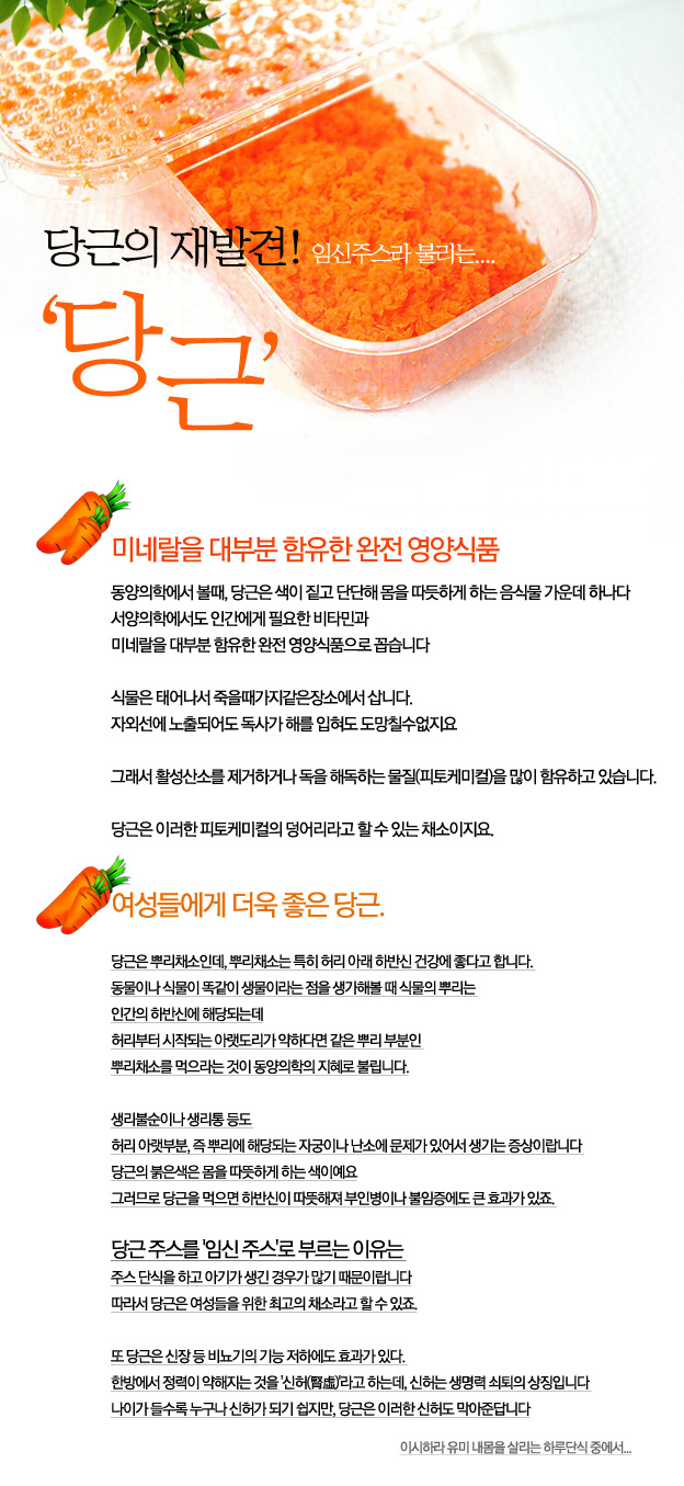 | 본문 | ![]() 당근은 꼭 유기농으로 드셔주세요. 여러 뿌리채소가 있지만, 당근은 흙 속의 모든 독소를 빨아들인다고 합니다. 좋은 땅에서 건강한 흙속에서 자란 맛있는 당근을 드세요^^ |