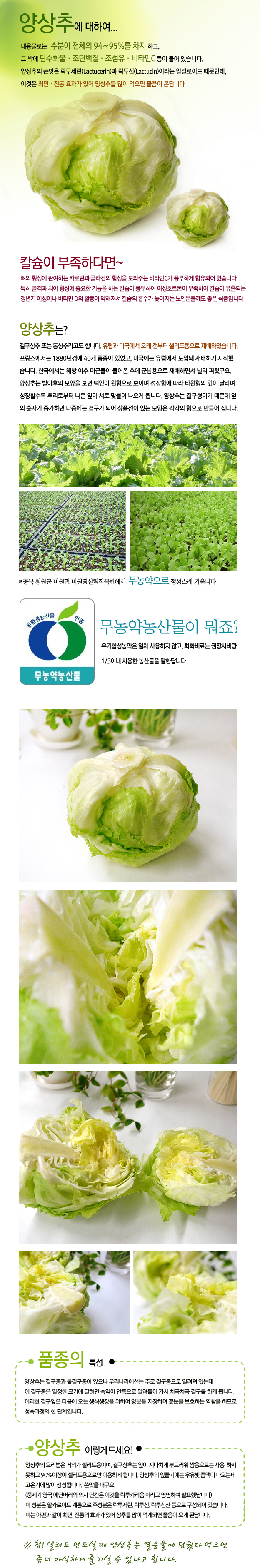 | 요약 | 국화과의 한해살이 또는 두해살이풀. 잎이 둥글고 넓으며 양배추처럼 결구성(結球性)인 개량종 상추이다. 식용하며 사철 재배한다. (Lactuca sativa var. capitata) - 학 명 : Lactuca sativa - 분 류 : 국화과 - 원산지: 유럽남부, 지중해연안, 서아시아 결구상추 또는 통상추라고도 합니다. 유럽과 미국에서 오래 전부터 샐러드용으로 재배하였습니 다. 프랑스에서는 1880년경에 40개 품종이 있었고, 미국에는 유럽에서 도입돼 재배하기 시작했 습니다. 한국에서는 해방 이후 미군들이 들어온 후에 군납용으로 재배하면서 널리 퍼졌구요. 양상추는 발아후의 모양을 보면 떡잎이 원형으로 보이며 성장함에 따라 타원형의 잎이 달리며 성장할수록 뿌리로부터 나온 잎이 서로 맞붙어 나오게 됩니다. 양상추는 결구형이기 때문에 잎 의 숫자가 증가하면 나중에는 결구가 되어 상품성이 있는 모양은 각각의 형으로 만들어 집니다. |