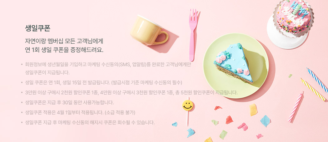 - 생일 쿠폰은 마케팅 수신동의(SMS, 앱알림)에 한해 연 1회 발급되며, 발급 후 미사용시 재발급되지 않습니다.