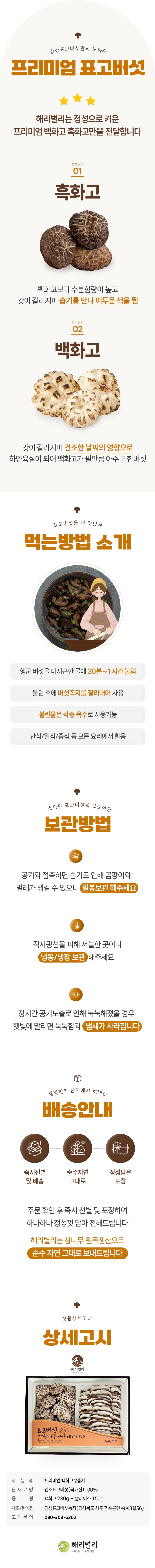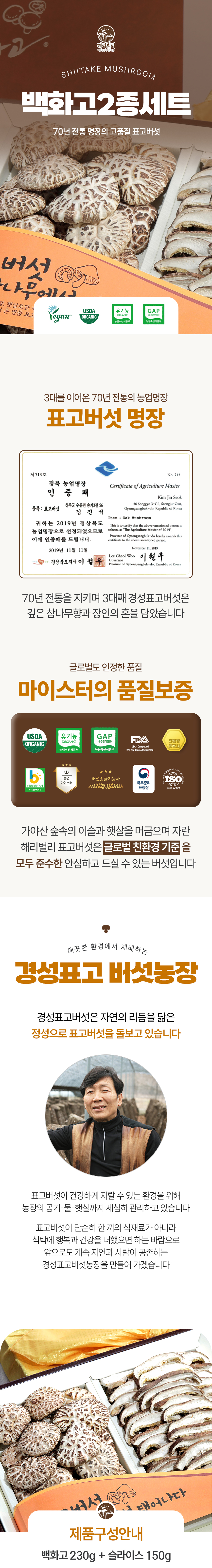 | 판매단위 | 2종(백화고 230g, 슬라이스 150g) |