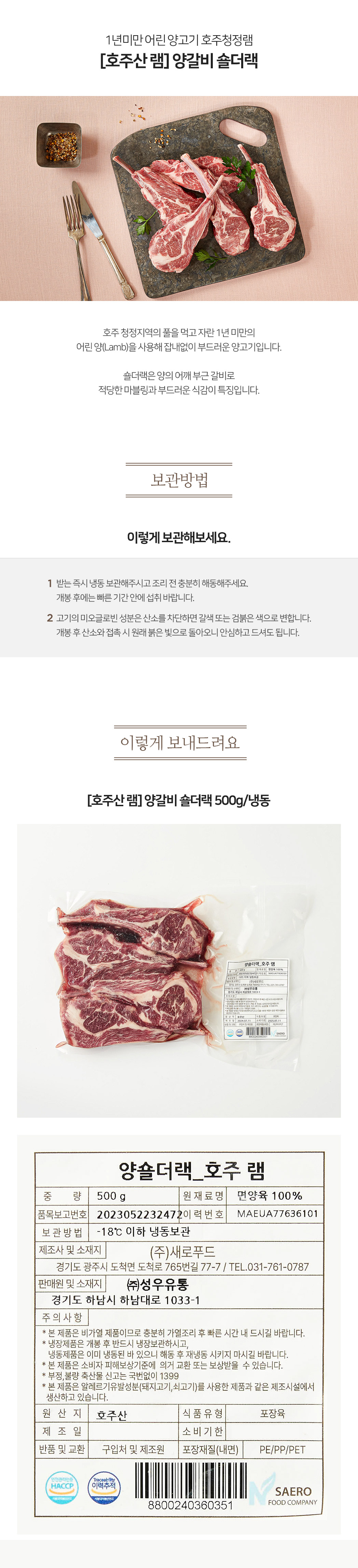 [호주산 램] 양갈비 숄더랙 500g/냉동