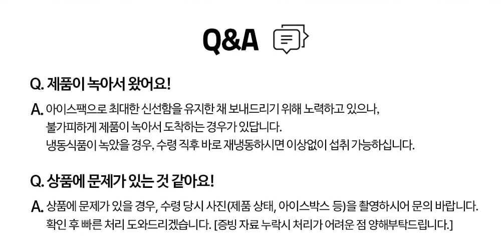 · 주의사항 - 일요일, 법정공휴일은 배송(도착)하지 않습니다. (명절 및 특수시즌 제외) - 배송지 정보와 받으시는 분의 장소 및 연락처가 불분명할 경우에는 배송이 지연될 수 있으며, 그로 인한 상품 변질에 대해서는 자연이랑이 책임지지 않습니다. |