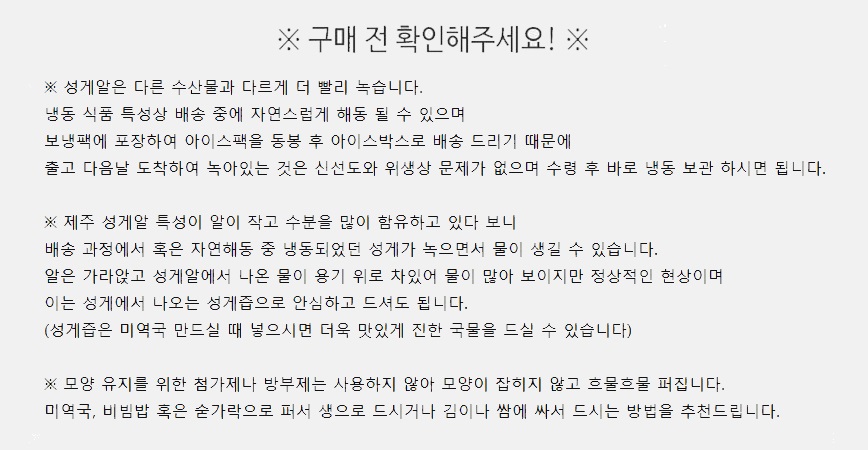 · 주의사항 - 일요일, 법정공휴일은 배송(도착)하지 않습니다. (명절 및 특수시즌 제외) - 배송지 정보와 받으시는 분의 장소 및 연락처가 불분명할 경우에는 배송이 지연될 수 있으며, 그로 인한 상품 변질에 대해서는 자연이랑이 책임지지 않습니다. |