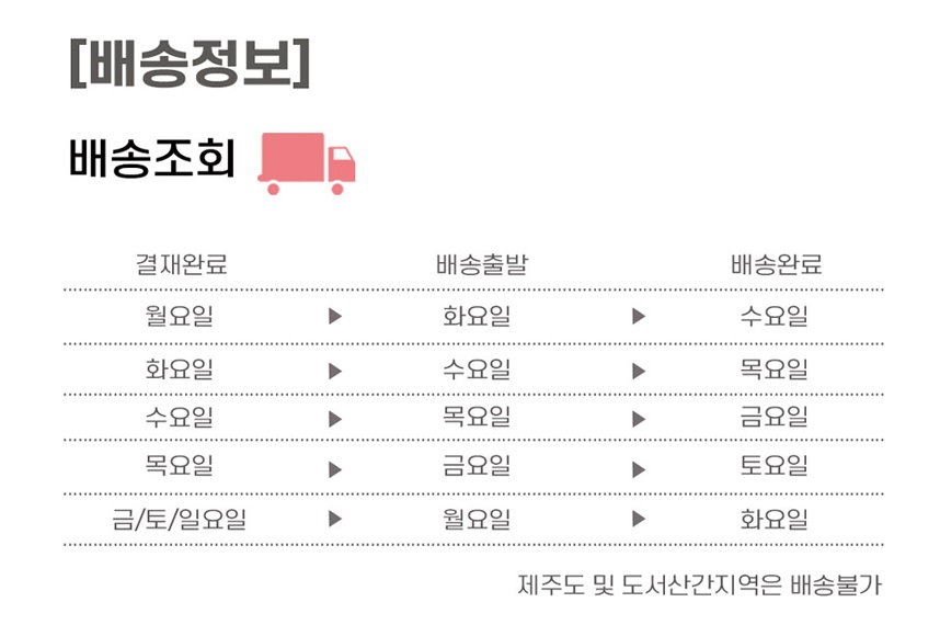 · 공휴일 전날은 출고 불가하며 당일 출고건은 다음날 배송됩니다.