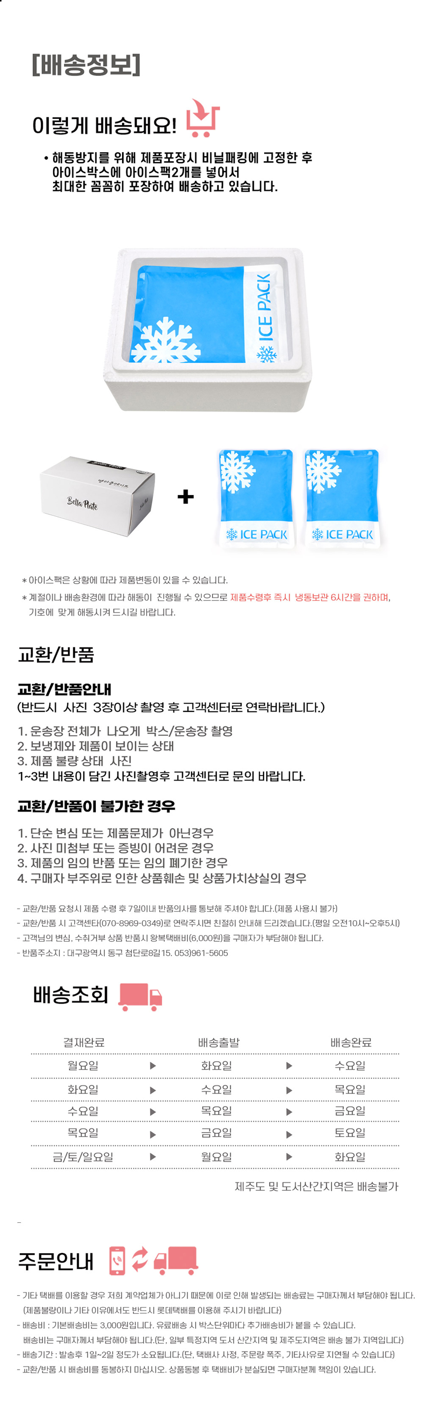 · 주의사항 - 일요일, 법정공휴일은 배송(도착)하지 않습니다. (명절 및 특수시즌 제외) - 배송지 정보와 받으시는 분의 장소 및 연락처가 불분명할 경우에는 배송이 지연될 수 있으며, 그로 인한 상품 변질에 대해서는 자연이랑이 책임지지 않습니다. |