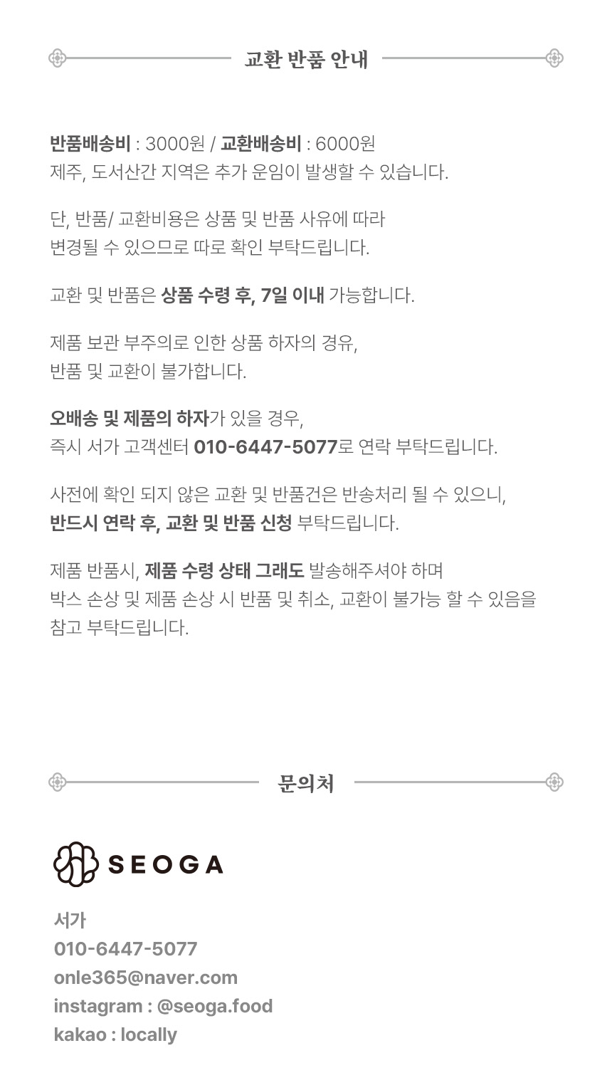 · 주의사항 - 일요일, 법정공휴일은 배송(도착)하지 않습니다. (명절 및 특수시즌 제외) - 배송지 정보와 받으시는 분의 장소 및 연락처가 불분명할 경우에는 배송이 지연될 수 있으며, 그로 인한 상품 변질에 대해서는 자연이랑이 책임지지 않습니다. |