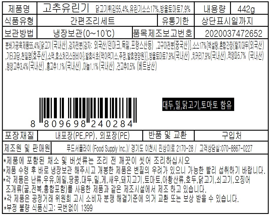 제품명 [앙트레] 쿠킹박스 고추유린기 442g
