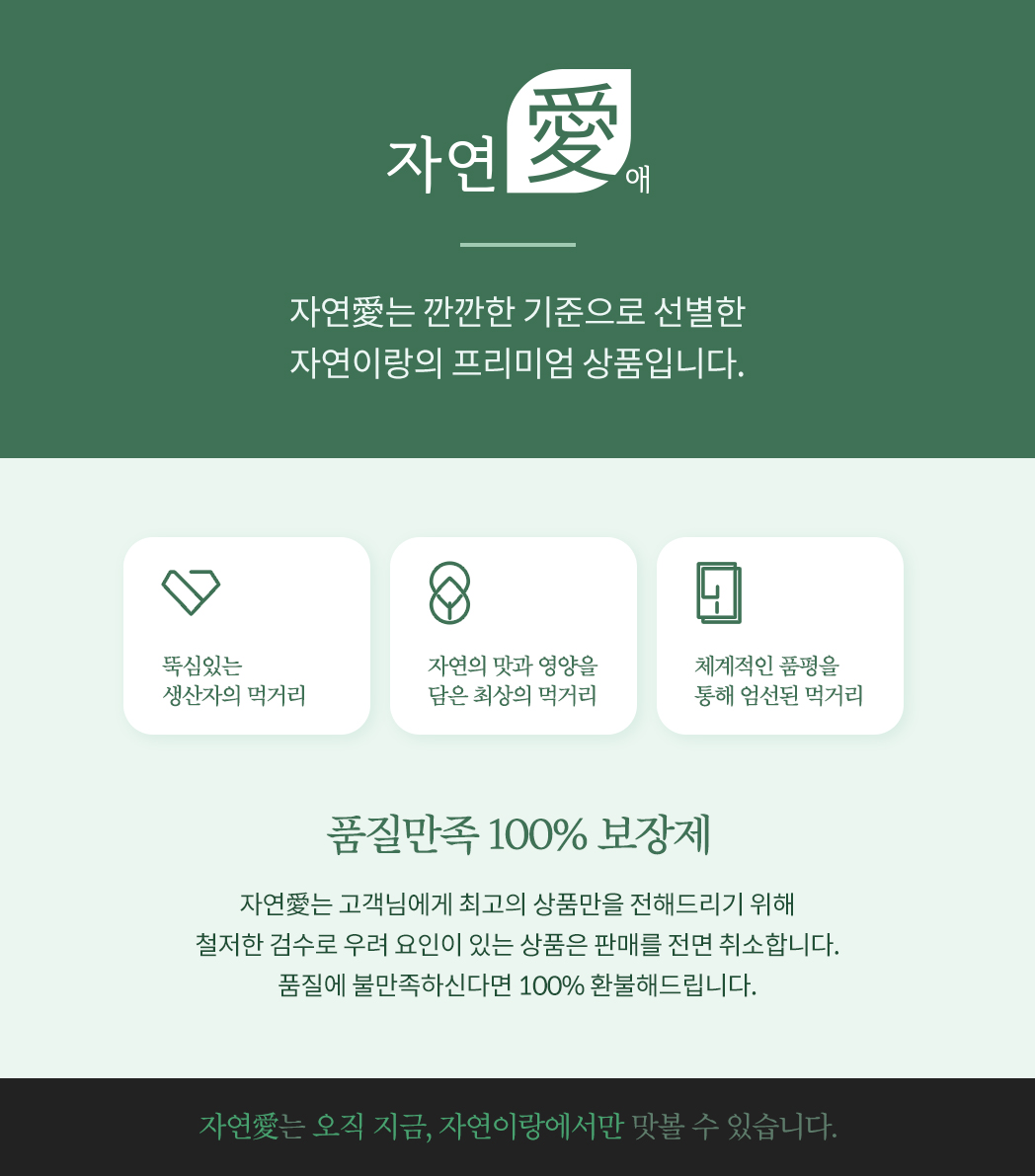 · 주의사항 - 일요일, 법정공휴일은 배송(도착)하지 않습니다. (명절 및 특수시즌 제외) - 배송지 정보와 받으시는 분의 장소 및 연락처가 불분명할 경우에는 배송이 지연될 수 있으며, 그로 인한 상품 변질에 대해서는 자연이랑이 책임지지 않습니다. |