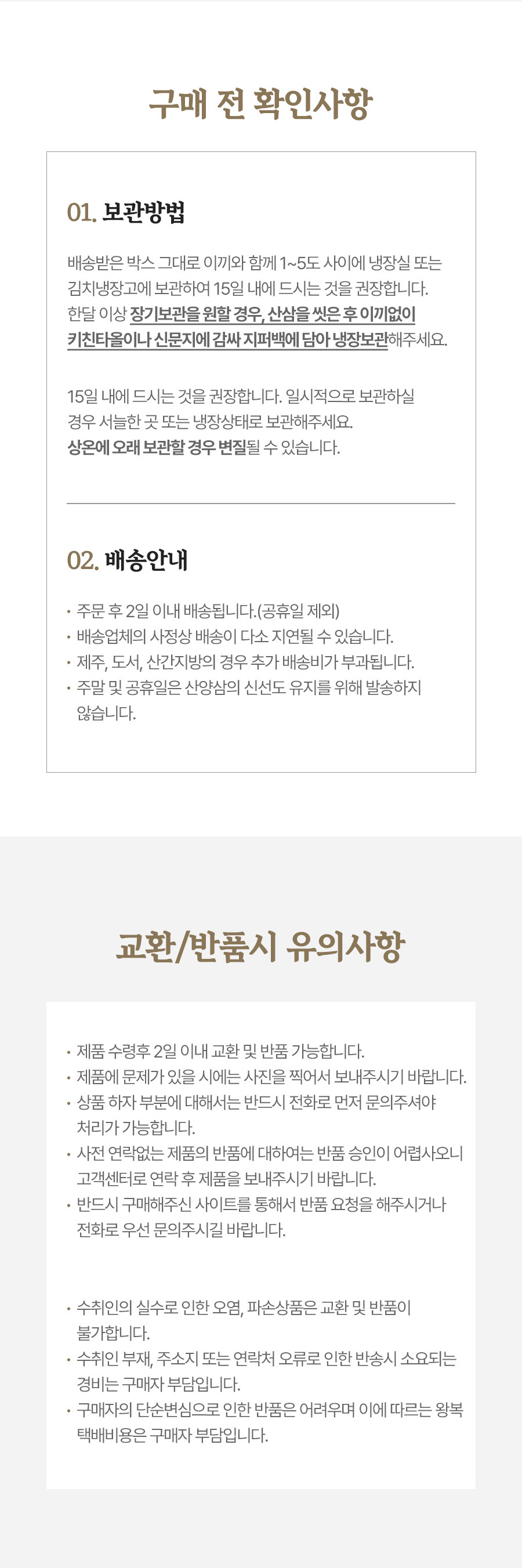 · 주의사항 - 일요일, 법정공휴일은 배송(도착)하지 않습니다. (명절 및 특수시즌 제외) - 배송지 정보와 받으시는 분의 장소 및 연락처가 불분명할 경우에는 배송이 지연될 수 있으며, 그로 인한 상품 변질에 대해서는 자연이랑이 책임지지 않습니다. |