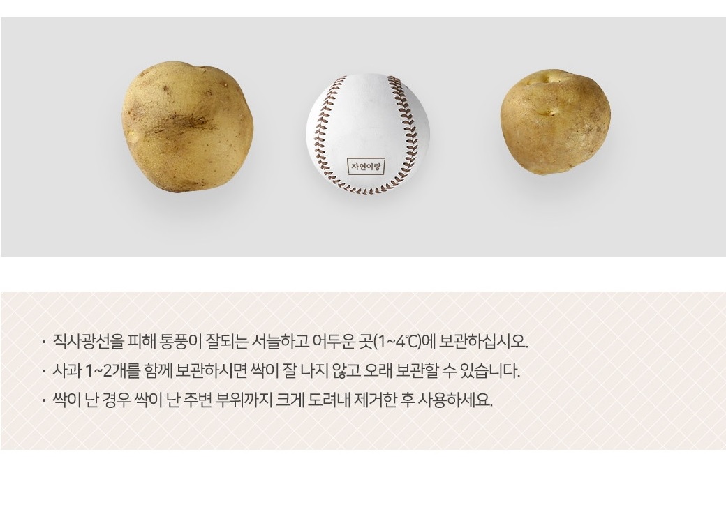 (감자 보관은 4~10°C가 가장 적당합니다. 실내 온도가 25°C가 넘어가는 여름철에는 냉장보관을 권장드립니다)