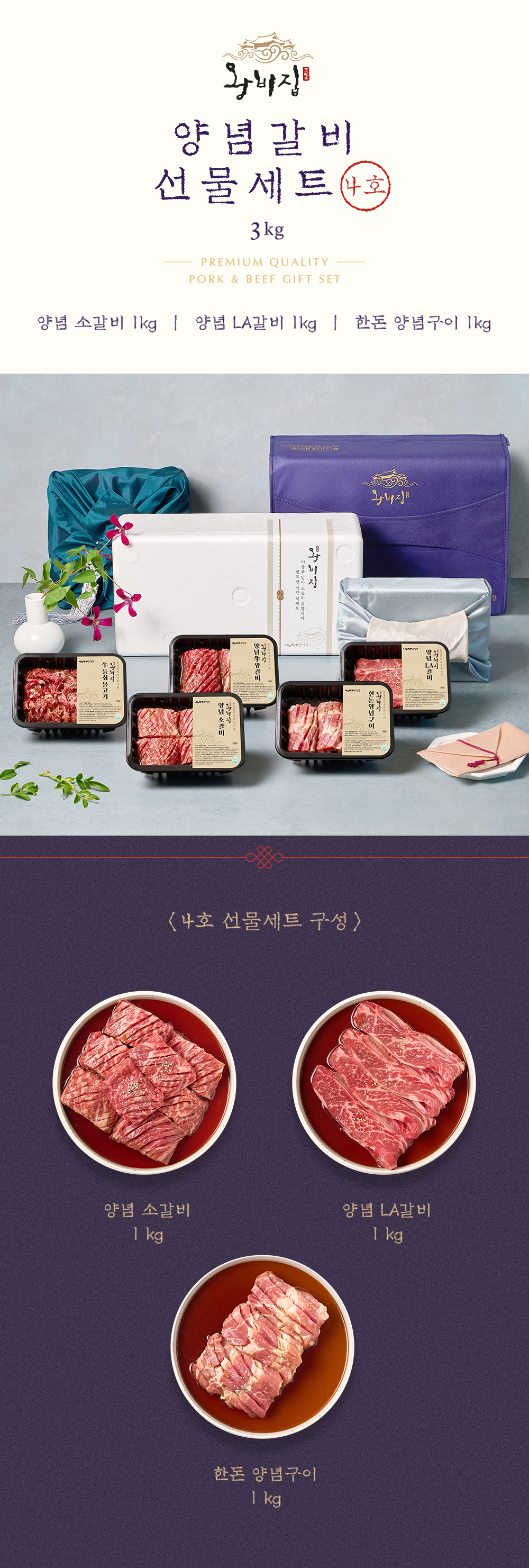 | 판매단위 | 3kg(양념 소왕갈비 1kg / 양념 LA갈비 1kg / 한돈 양념구이 1kg) |