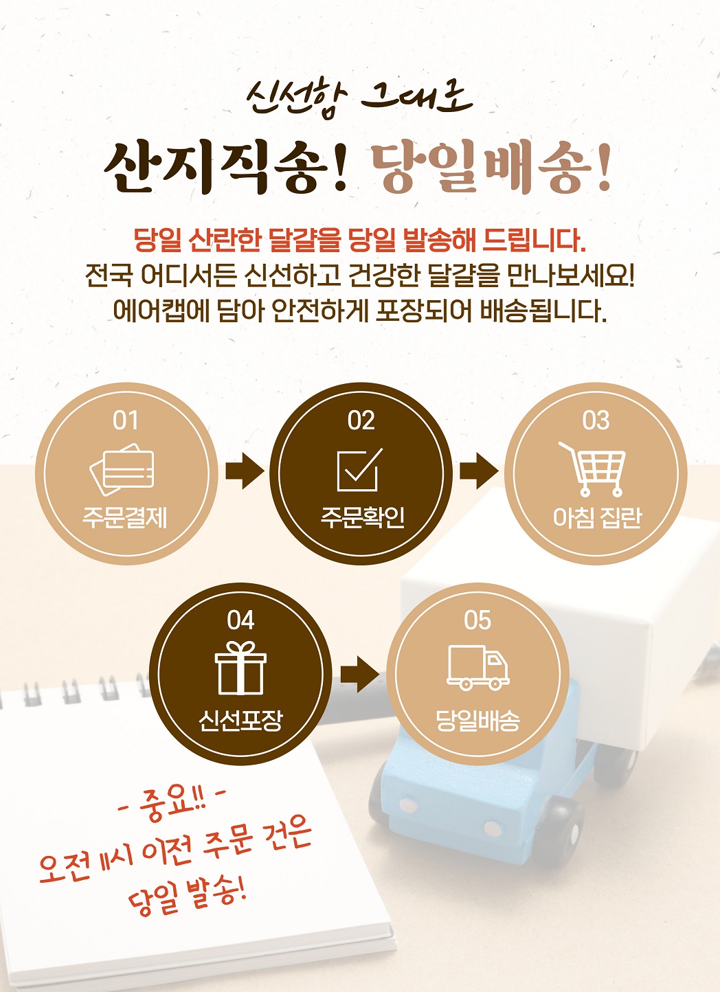 농장에서 오전에 나온 달걀을 오후에 가장 신선한 상태로 바로 보내드립니다.