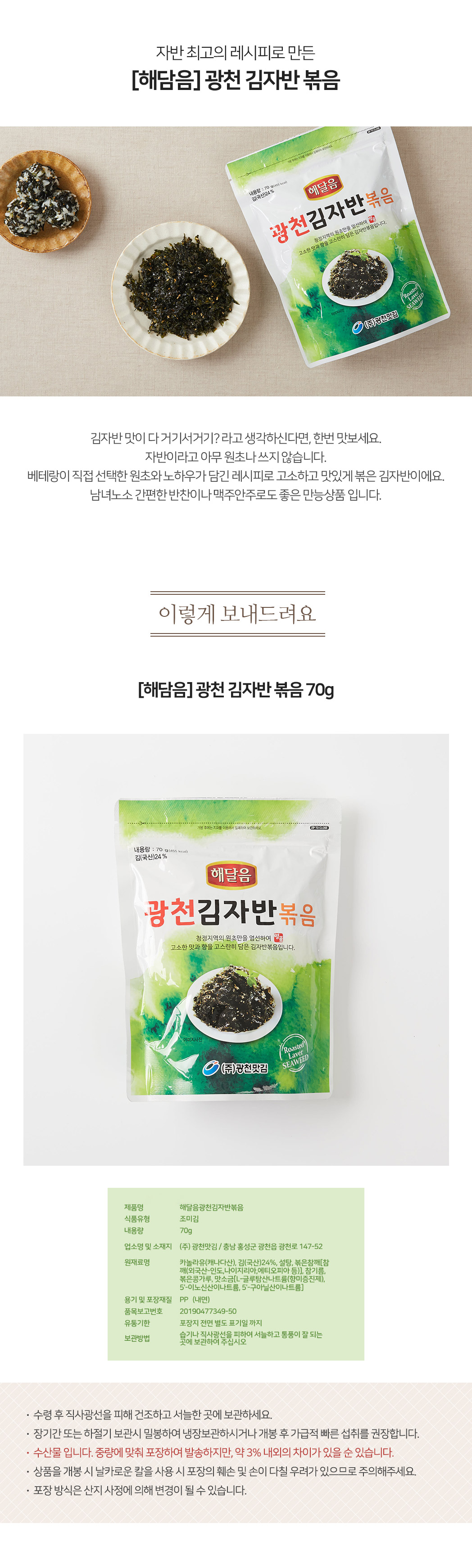 · 주의사항 - 일요일, 법정공휴일은 배송(도착)하지 않습니다. (명절 및 특수시즌 제외) - 배송지 정보와 받으시는 분의 장소 및 연락처가 불분명할 경우에는 배송이 지연될 수 있으며, 그로 인한 상품 변질에 대해서는 자연이랑이 책임지지 않습니다. |