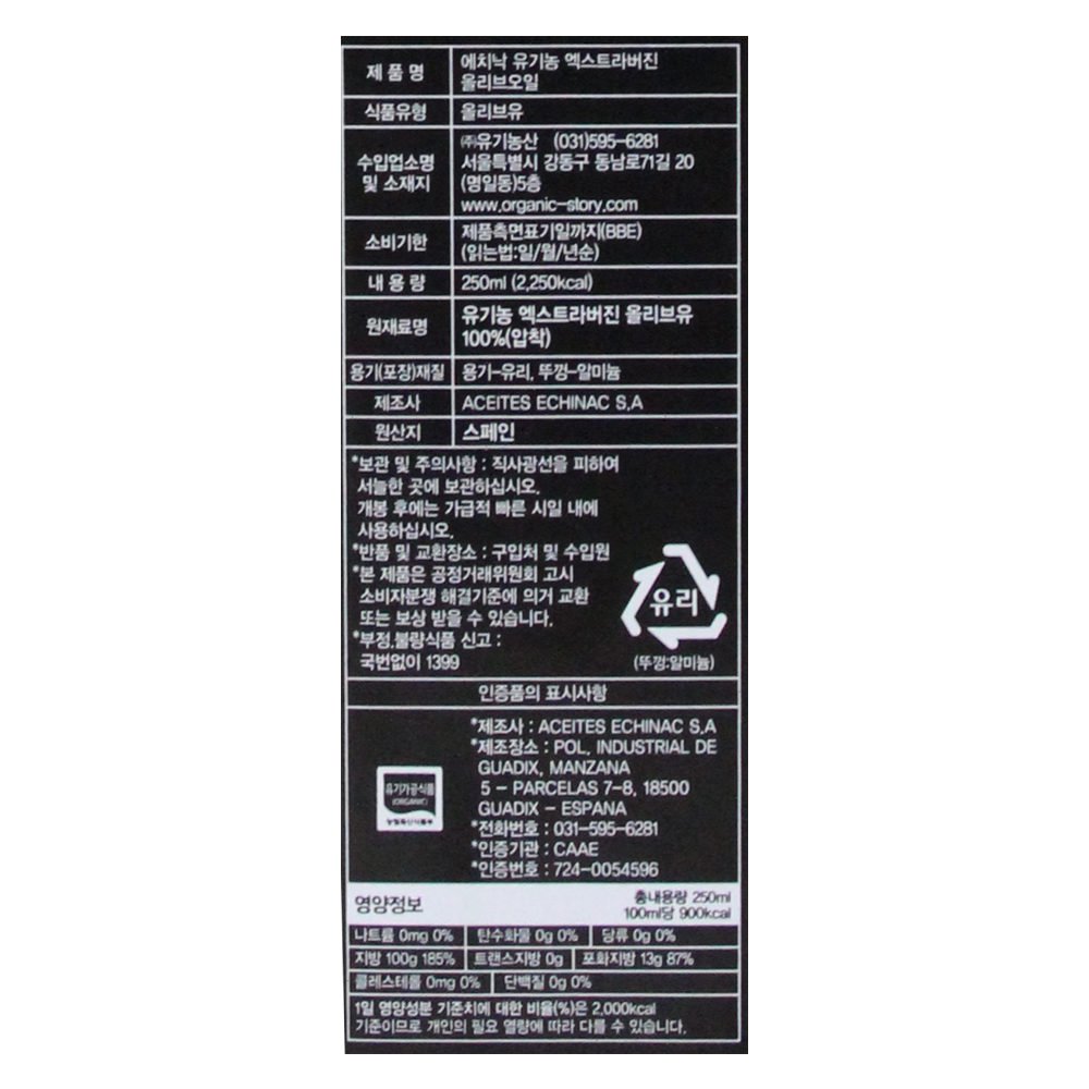제품명 [에치올리바] 유기농 엑스트라버진 올리브유 250ml